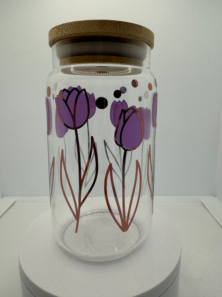 This gorgeous Tulip design in a reusable glass can with glass straw & bamboo lid - 16oz