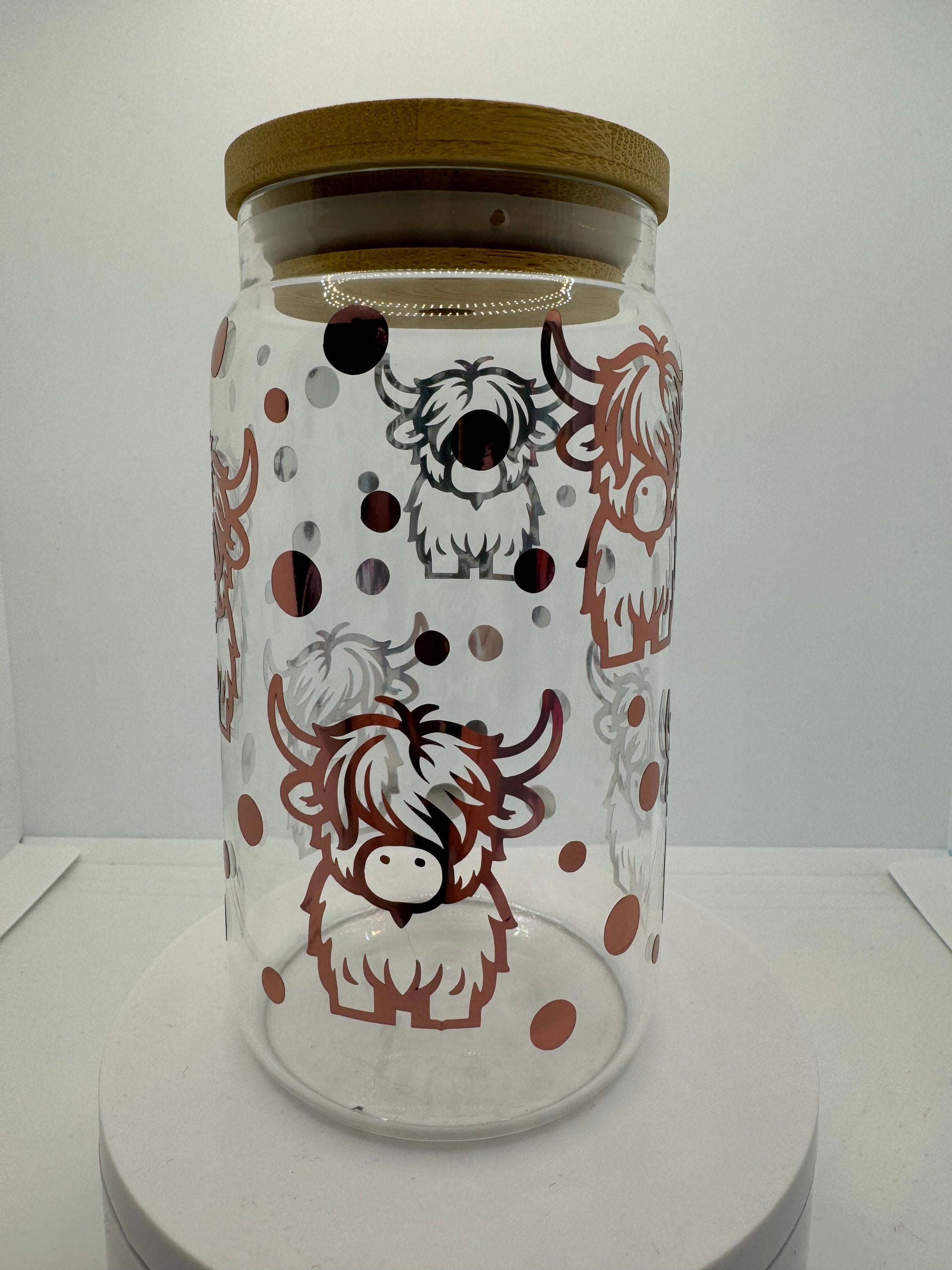 This gorgeous Highland Cow design in a reusable glass can with glass straw & bamboo lid - 16oz